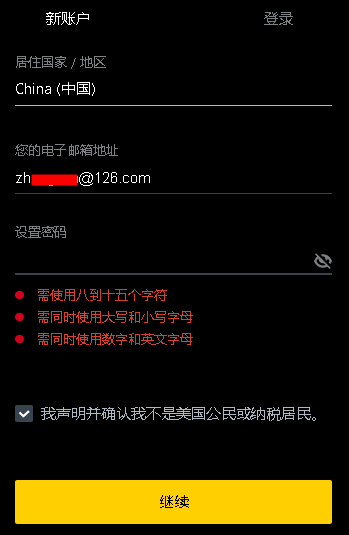 1、打开【Exness外汇注册地址】,右上角新账户选择国家地区China(中国),密码必须包含大写字母、小写字母、数字,密码设置8位到15位。