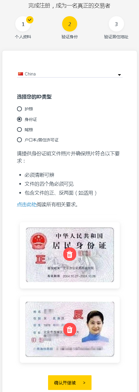 8、进行认证验证,提交身份证照片两面,必须清晰完整,提供的文件必须为 JPEG、PNG、BMP 或 PDF 格式。上传的文件大小不得超过 5 MB。
